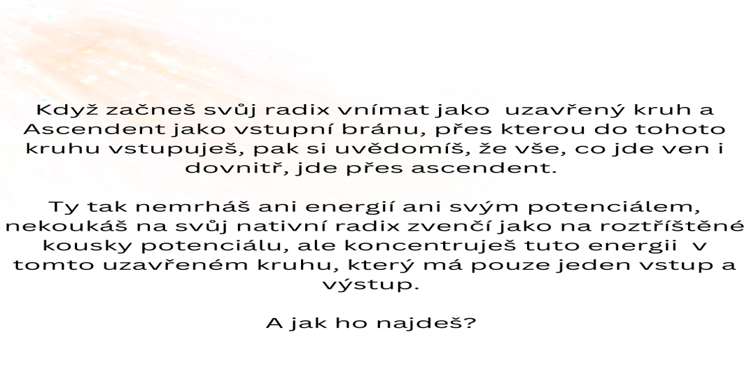 Jak čelíte světu? Jaký děláte první dojem? Jak se projevujete vůči tomu, co je tam venku a jak to lidé kolem vás vnímají ?To vše je ascendent. Ale stačí to? Když se budete dívat na svůj radix zvenčí, můžete vnímat ascendent jako jeden bod z mnoha, a potenciál, který váš horoskop představuje, pak může utíkat na všechny strany. Co když ale budeme náš radix vnímat zevnitř. Tak, že vstoupíme doprostřed a zavřeme za sebou dveře. Jako uzavřený kruh, aby se naše energie a potenciál nerozutekli do všech směrů. A těmi dveřmi je právě náš Ascendent. Protože pokud vnímáme ascendent jako to, jak čelíme vnějšímu světu, tak bychom se také měli ptát proč mu čelíme? Co je naším úkolem, proč mám zrovna tenhle ascendent a ne jiný?